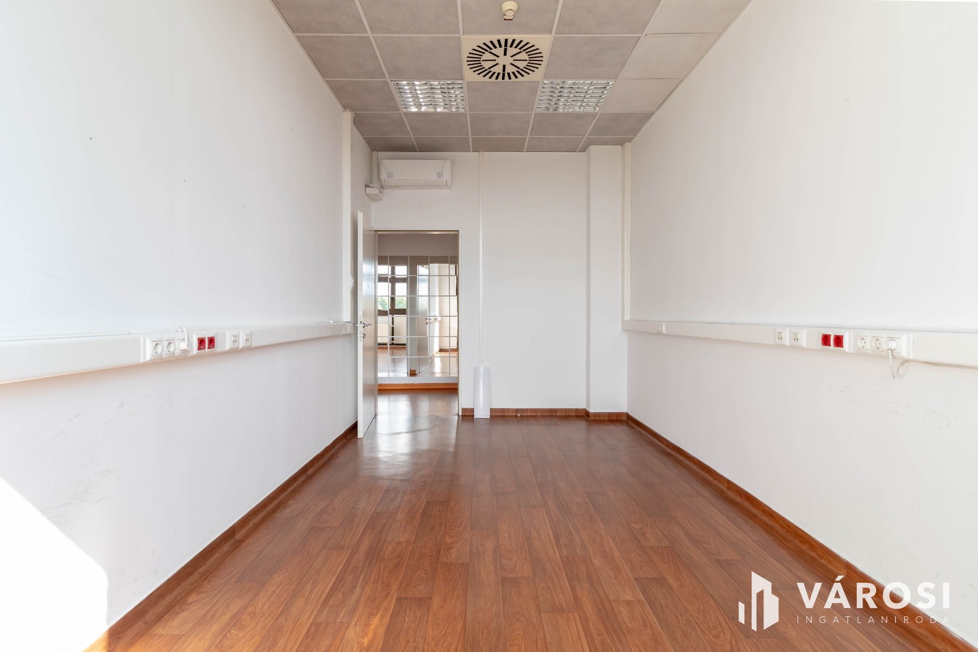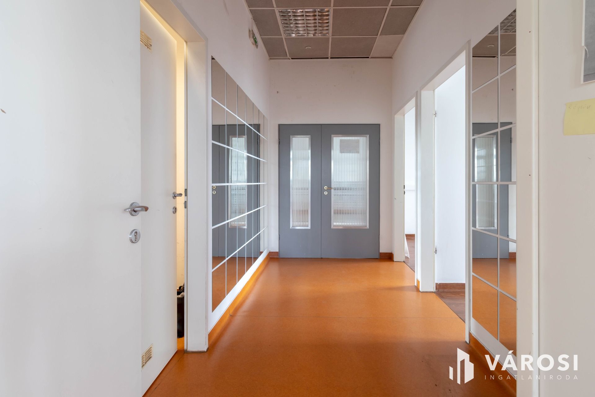 A 2. emeleten található, belső vizesblokkal rendelkező, 132 m2-es ingatlanrészben van egy 77 m2-es nagy terem, valamint két 17 m2-es iroda. A 8 m2-es előtérből nyílik mindegyik, valamint innen nyílik a 7 m2-es konyha is. A konyhából pedig az 5 m2-es mosdó, külön férfi és női wc-vel.
