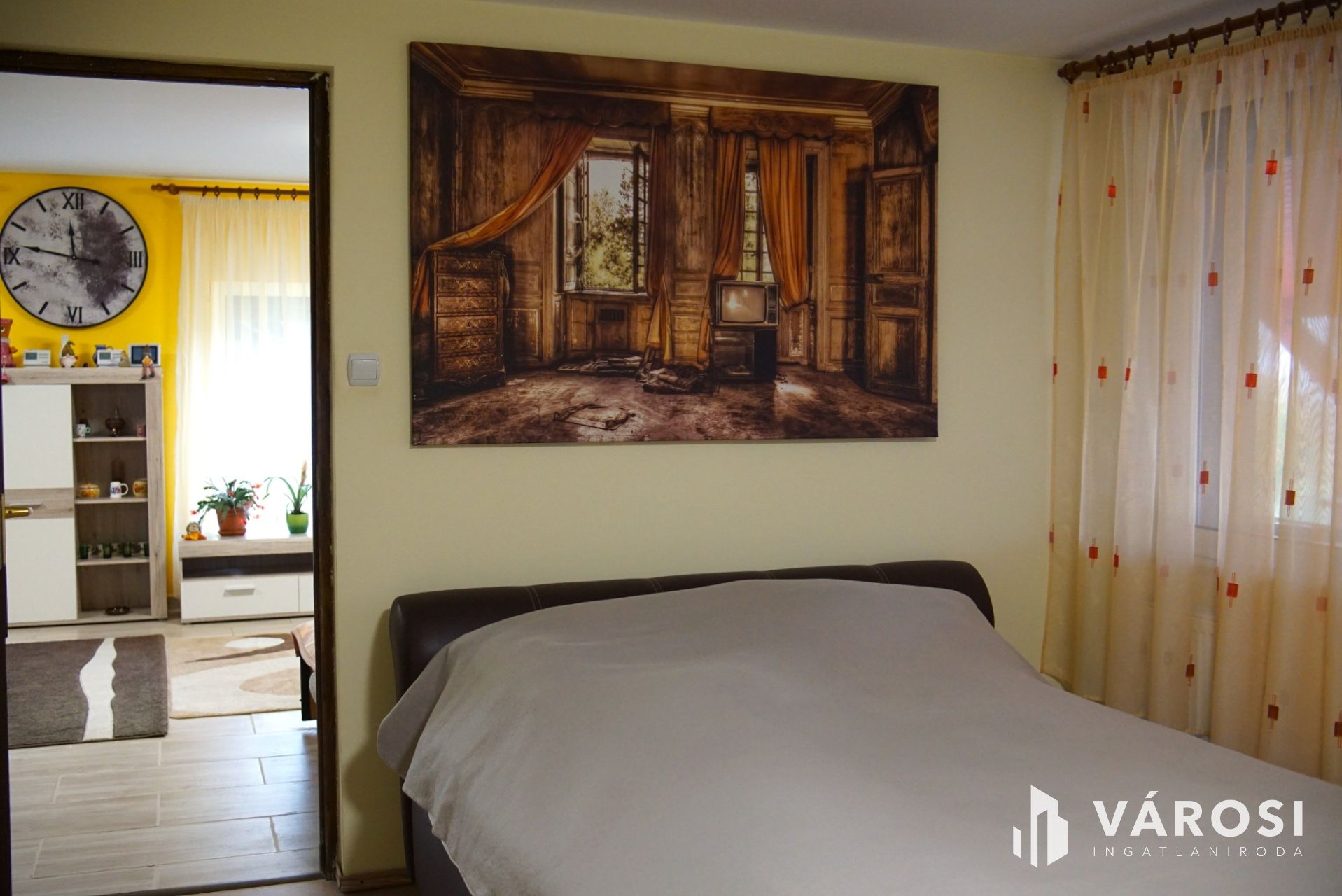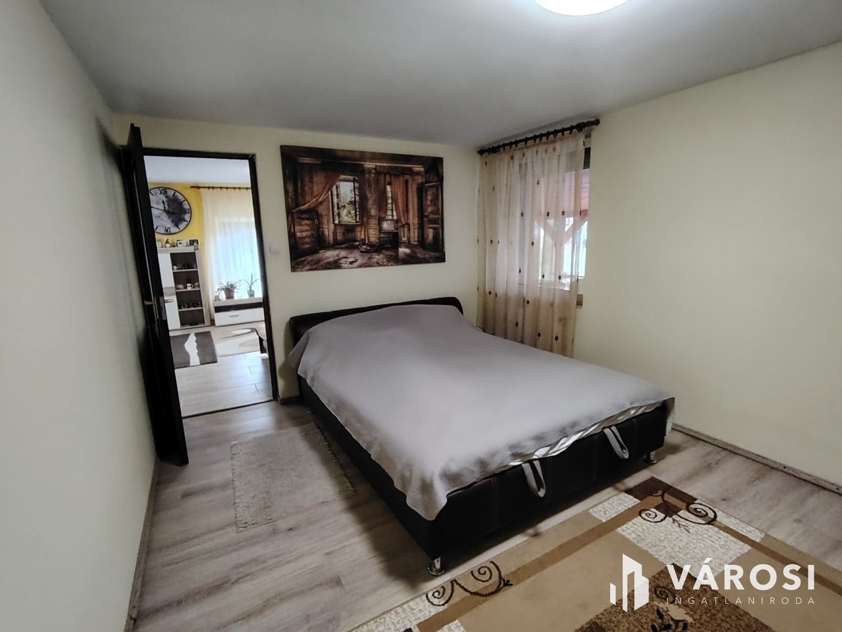 A bejárati ajtón belépve nagyméretű előszobába lépünk, ahonnan három hálószoba is nyílik, melyek közül a legnagyobb 20 négyzetméter, akár egy másik nappalinak is elmenne. Ha azonban balkézfelé megyünk tovább egy 15 négyzetméteres hallba jutunk, ahol hatalmas gardróbszekrény kapott helyet és innen nyílik a fürdőszoba és a mellékhelység, ahol a gépészet is el lett helyezve. A hallból az óriási méretű, majdnem 43 négyzetméteres, L alakú nappali-konyhába juthatunk egy széles ajtó nélküli falnyíláson. Rendkívül praktikusan lett a konyha kialakítva, mert bár egy légtérben van a nappalival, mégis az L-alakú kialakítás miatt nem zavarják egymást a konyhai folyamatok és a nappaliban űzött tevékenységek. Ha a 40 négyzetméteres terasz ajtaját is kinyitjuk, akkor egy hatalmas, 80 négyzetméteres teret kapunk a konyhától a kertig, ahol a családi és baráti rendezvények a lehető legkényelmesebben tarthatóak meg! És még nincs vége! A nappaliból nyílik még egy hálószoba, ami kiváló lehet dolgozószobának, vendégszobának vagy amit a fantáziánk csak szeretne. A szobák laminált padlóval fedettek, a nappali, a konyha, az előszoba, a fürdőszoba és a mellékhelyiség pedig hidegburkolatot kapott. A fűtés kombikazánról, radiátorokkal történik, de a klímát is lehet fűtésre használni. A szigetelésnek köszönhetően rendkívül alacsony a fűtési költség, télen 10000 Ft a gázszámla, míg nyáron mindössze 3000 Ft. A gyönyörűen karbantartott kertben a ház mellett, ahol díszkőburkolattal kialakított autóbeállási lehetőség lett kialakítva áll három lemezgarázs, hogy minden jármű biztonságban lehessen az időjárás viszontagságaitól. A kertben egy kicsi, de gyönyörű dísztó is helyet kapott! A környék gyönyörű, a ház tökéletes, ide már tényleg csak költözni kell!