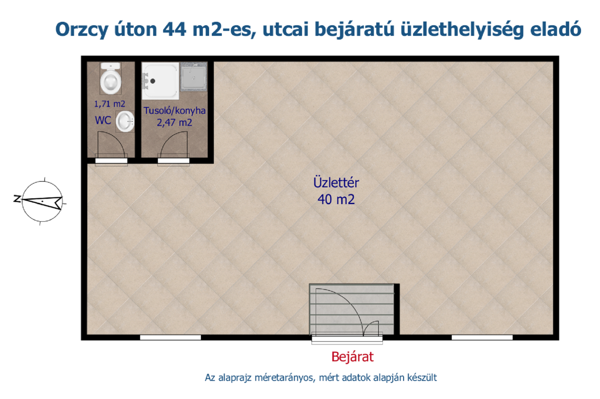 A fotók között látható alaprajz szerinti elrendezésben a 44 m2-es térből leválasztásra került egy mosdó és egy tusoló/konyha funkciót ellátó helyiség, amelyek egy üzlethelyiség funkcionális és higiéniai szempontjainak teljesen megfelelnek.