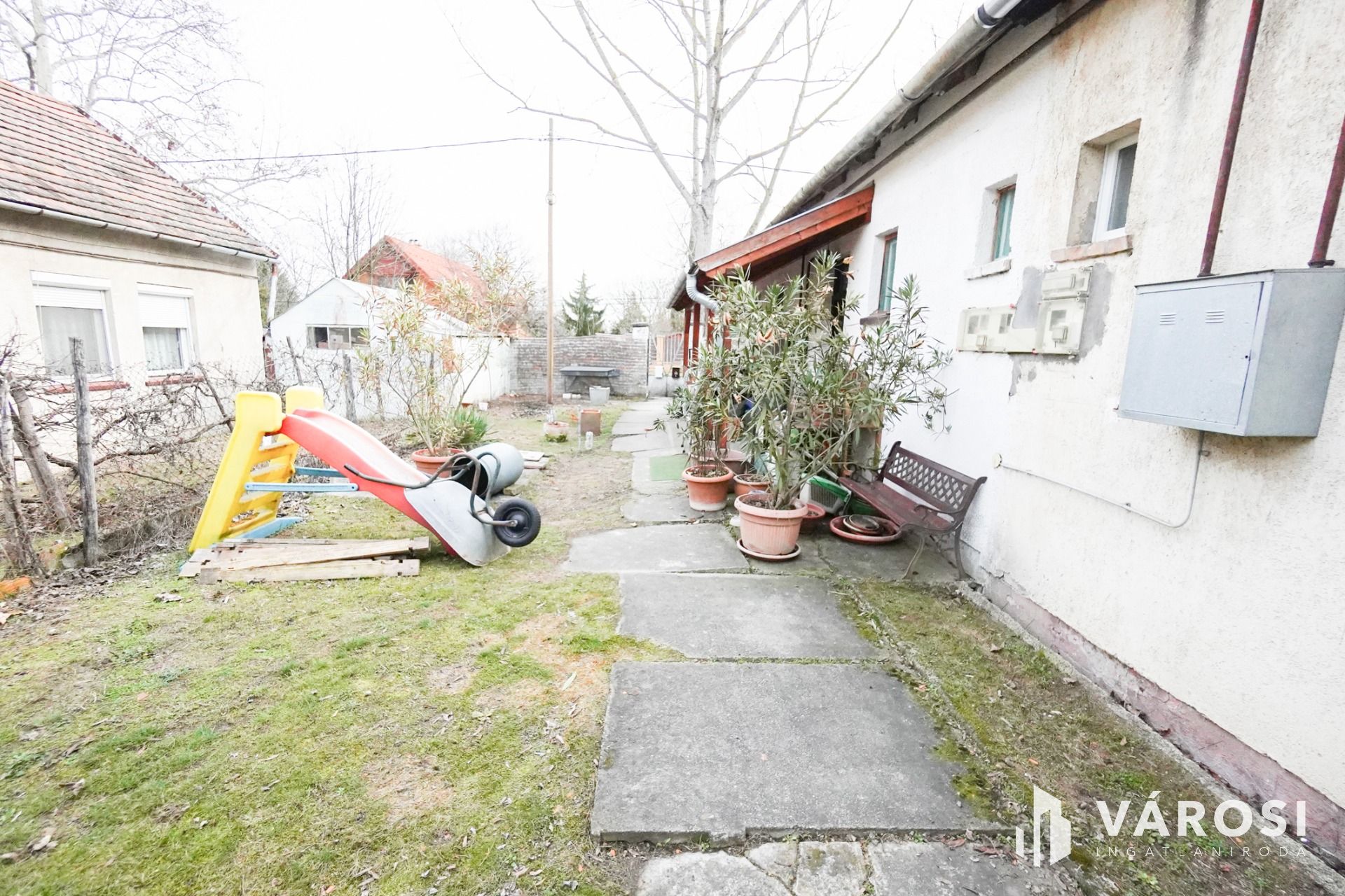 Akár 2 autó parkolására is alkalmas előkert, családi vagy társasági életre alkalmas hátsókert mellett a kert végében méretes, zárható tároló.