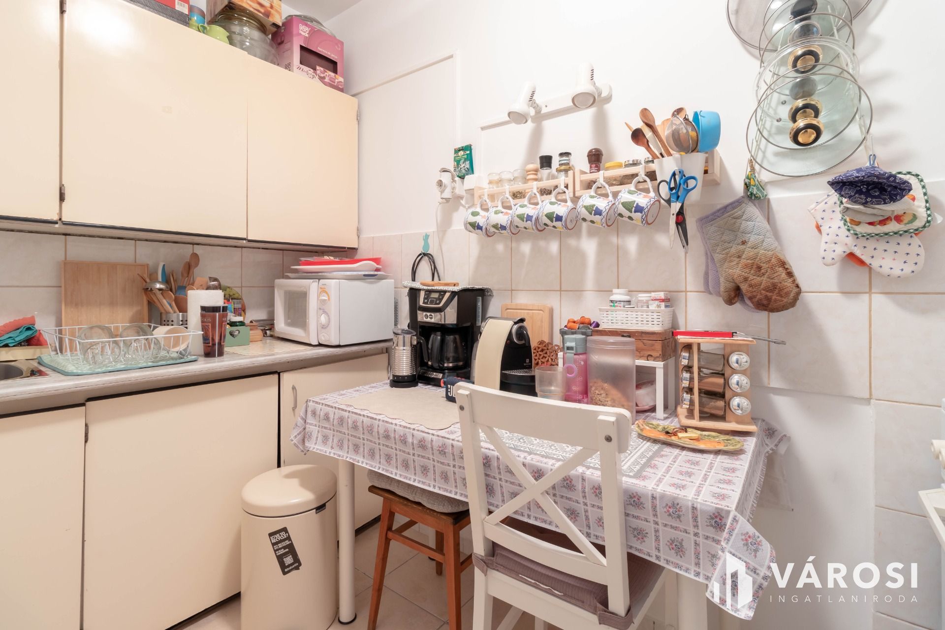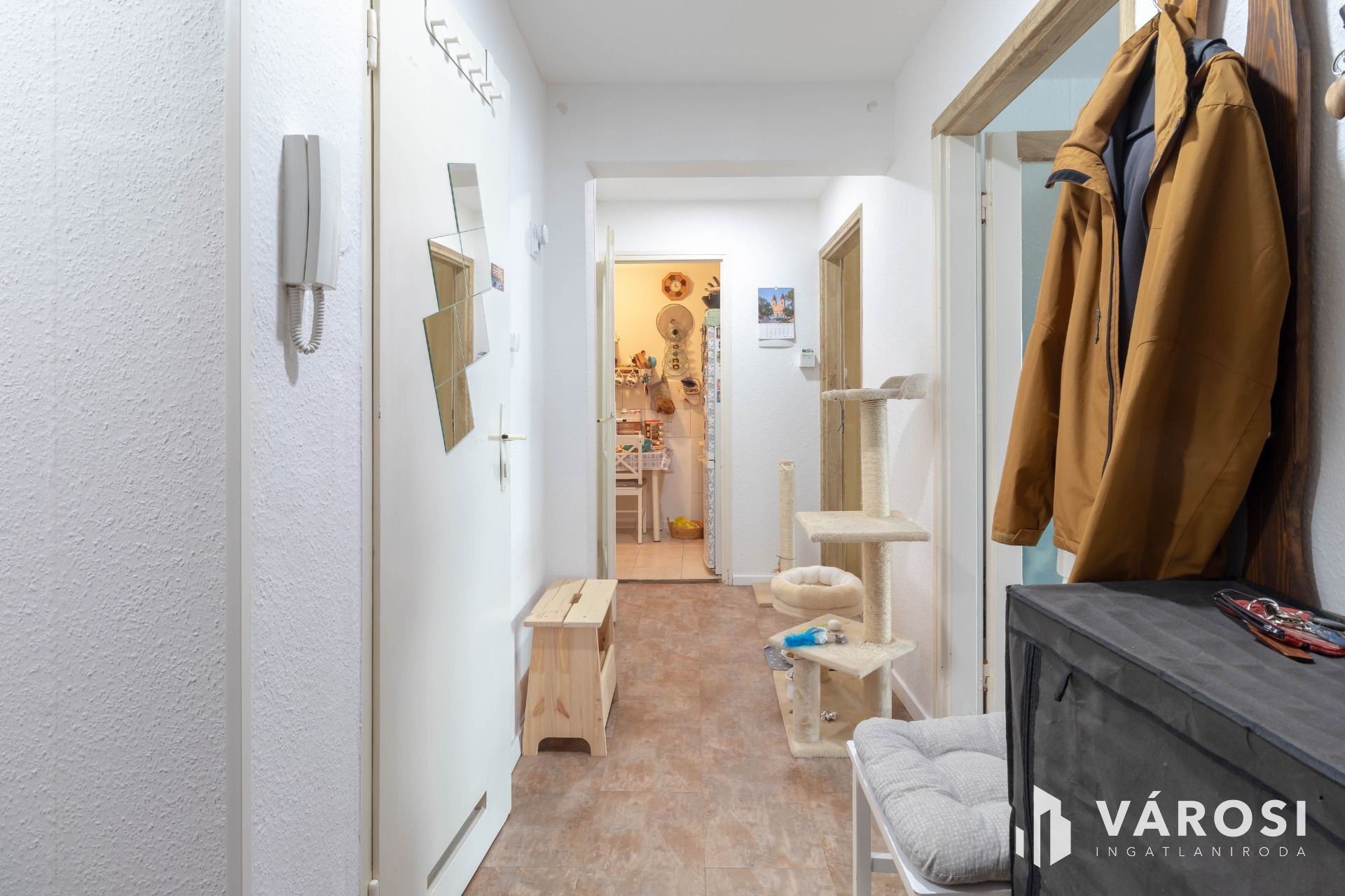 A bejárat melletti gardróbban – ahogy a fotókon látható – mosógéphez, szárítógéphez kialakított vizes csatlakozás érhető el.